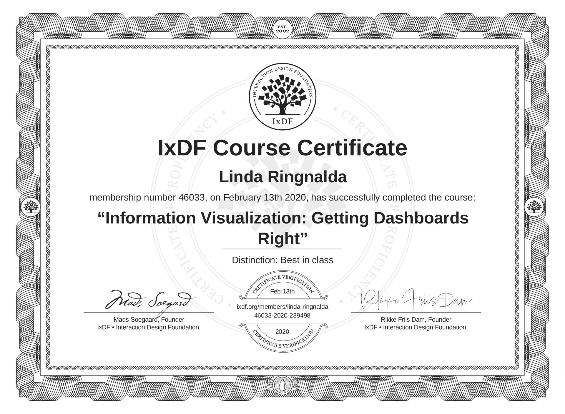 Linda Ringnalda's IxDF Course Certificate: Information Visualization: Getting Dashboards Right