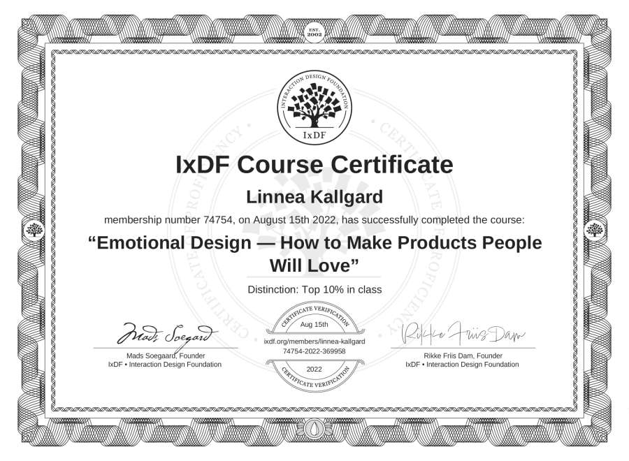 Linnéa Källgård's IxDF Course Certificate: Emotional Design — How to Make Products People Will Love