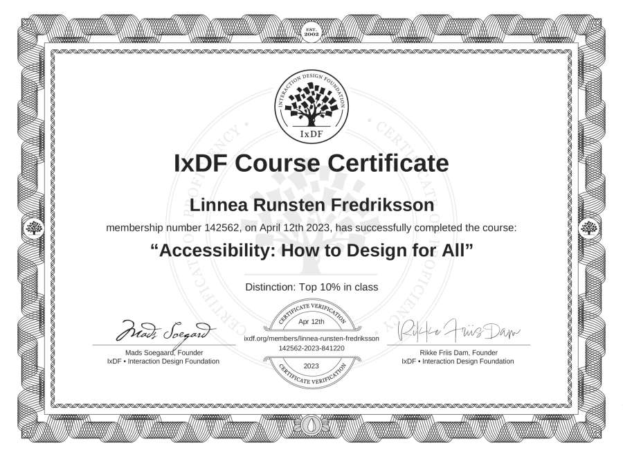 Linnéa Runsten Fredriksson's IxDF Course Certificate: Accessibility: How to Design for All