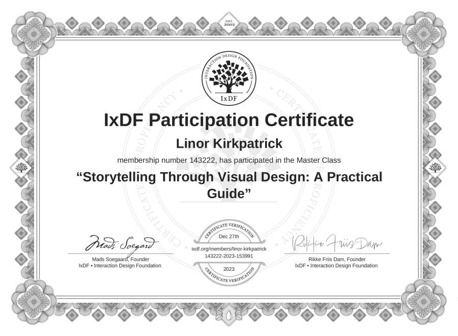 Linor Kirkpatrick's IxDF Masterclass Certificate: Storytelling Through Visual Design: A Practical Guide