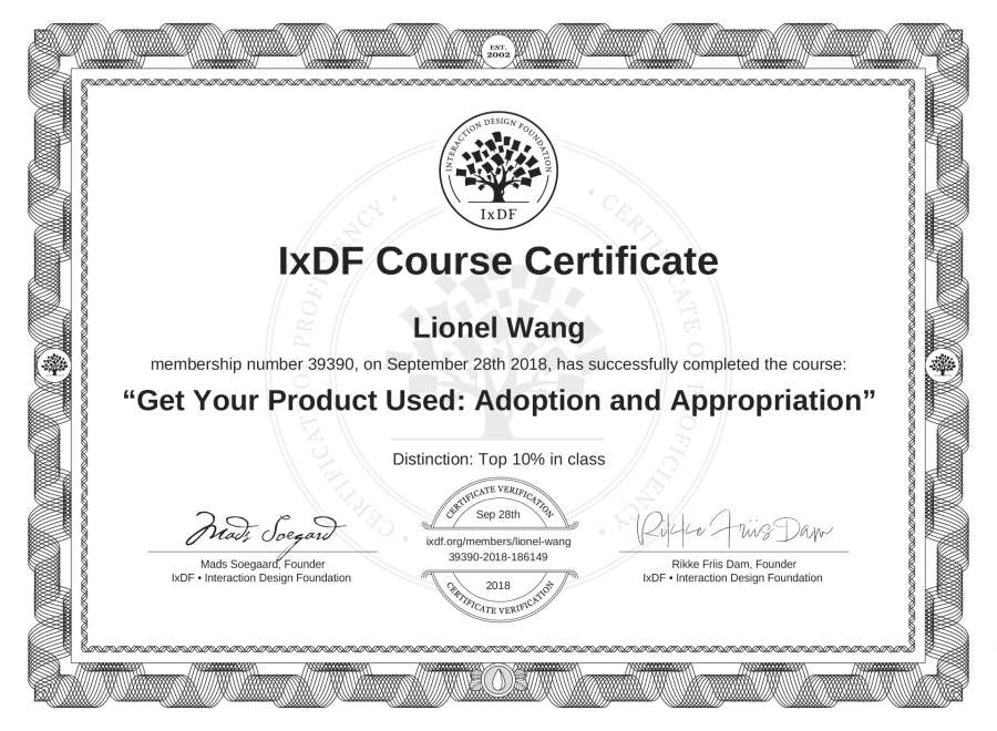 Lionel Wang's IxDF Course Certificate: Get Your Product Used: Adoption and Appropriation