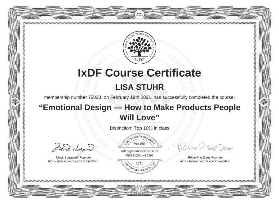 LISA STUHR's IxDF Course Certificate: Emotional Design — How to Make Products People Will Love