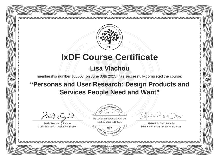 Lisa Vlachou's IxDF Course Certificate: Personas and User Research: Design Products and Services People Need and Want