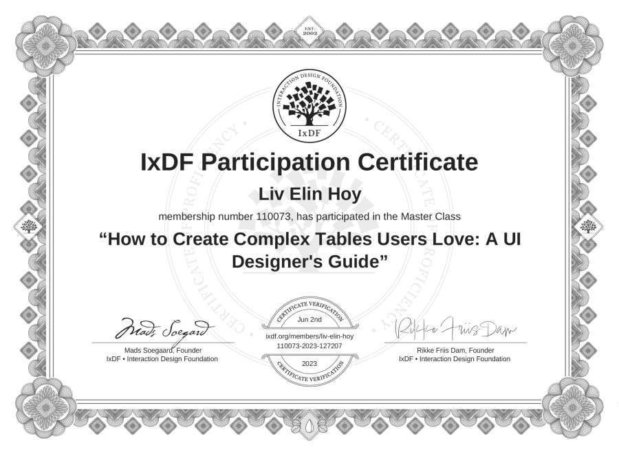 Liv Elin Høy's IxDF Masterclass Certificate: How to Create Complex Tables Users Love: A UI Designer's Guide