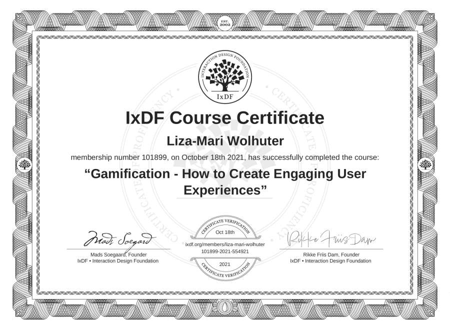 Liza-Mari Wolhuter's IxDF Course Certificate: Gamification - How to Create Engaging User Experiences
