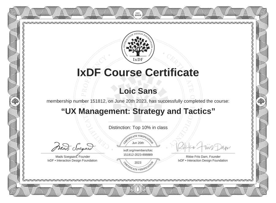 The IxDF Course Certificate above is awarded to Loïc Sans with a Top 10% Distinction in formal recognition of their coursework surpassing the rigorous benchmarks of exceptional performance established by the IxDF Educational Codex.