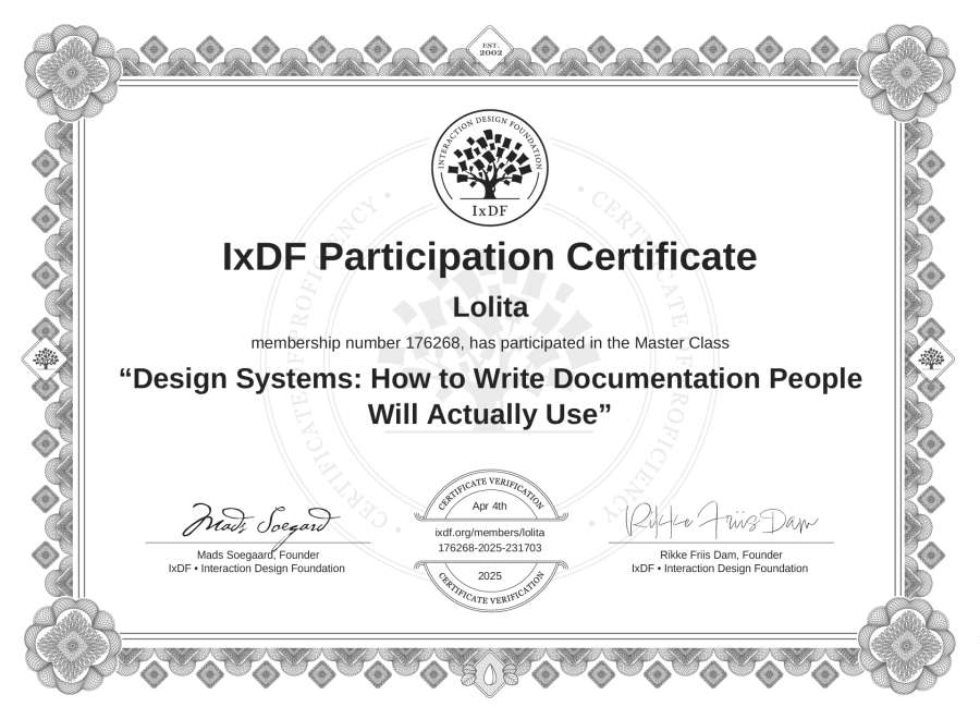 Lolita's IxDF Masterclass Certificate: Design Systems: How to Write Documentation People Will Actually Use