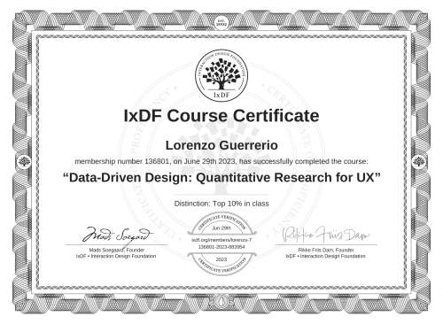 IxDF Course Certificates are awarded to Lorenzo Guerrerio in formal recognition of their coursework surpassing the rigorous benchmarks of exceptional performance established by the IxDF Educational Codex.