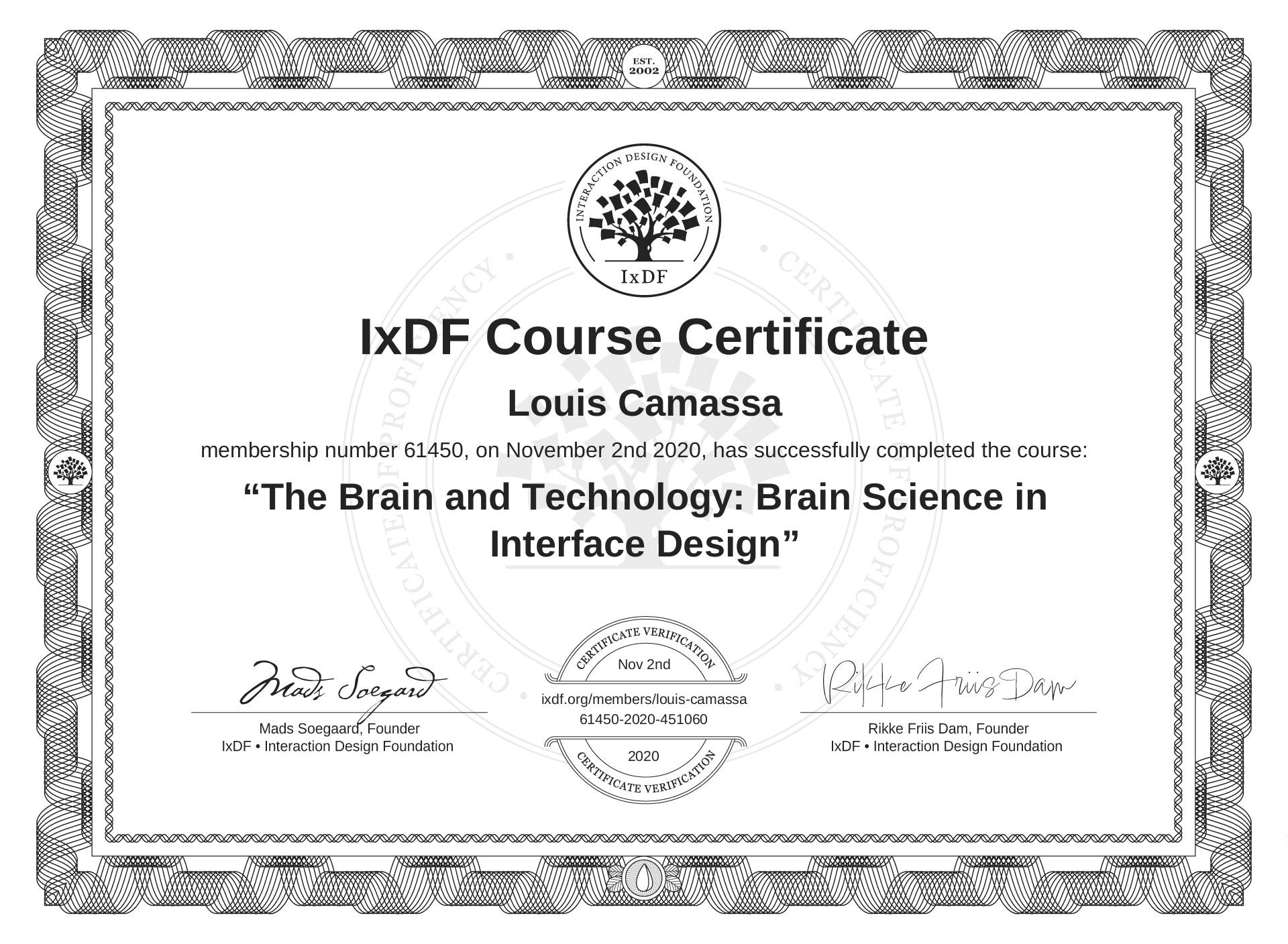 Louis Camassa's IxDF Course Certificate: The Brain and Technology: Brain Science in Interface Design