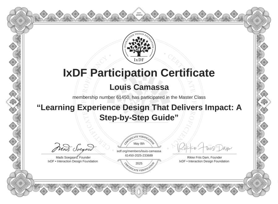 Louis Camassa's IxDF Masterclass Certificate: Learning Experience Design That Delivers Impact: A Step-by-Step Guide