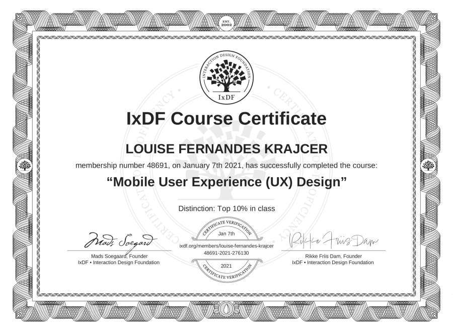 LOUISE FERNANDES KRAJCER's IxDF Course Certificate: Mobile User Experience (UX) Design