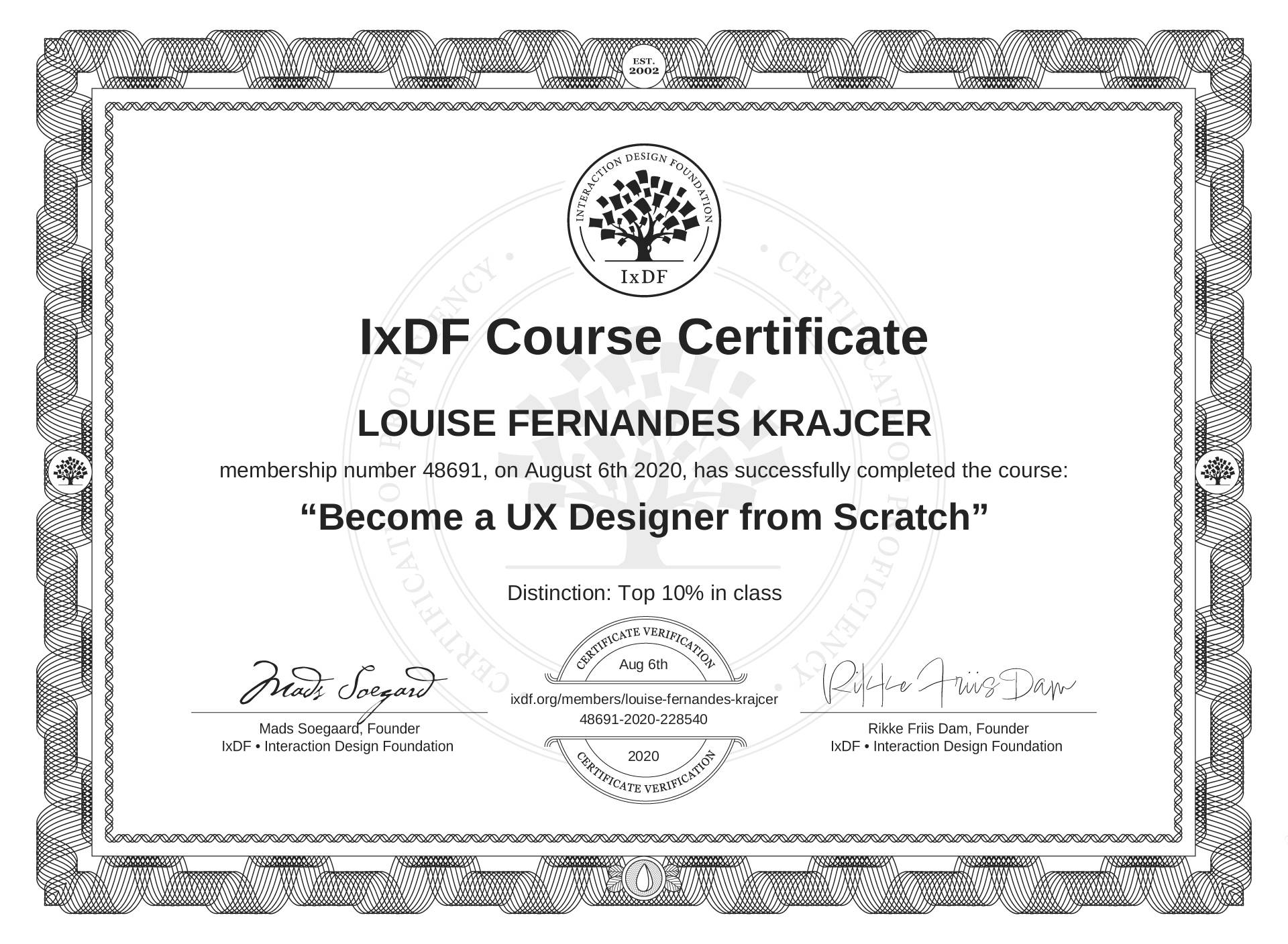 The IxDF Course Certificate above is awarded to LOUISE FERNANDES KRAJCER with a Top 10% Distinction in formal recognition of their coursework surpassing the rigorous benchmarks of exceptional performance established by the IxDF Educational Codex.