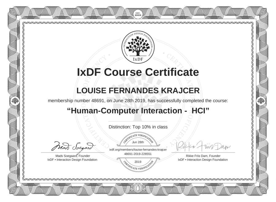 The IxDF Course Certificate above is awarded to LOUISE FERNANDES KRAJCER with a Top 10% Distinction in formal recognition of their coursework surpassing the rigorous benchmarks of exceptional performance established by the IxDF Educational Codex.