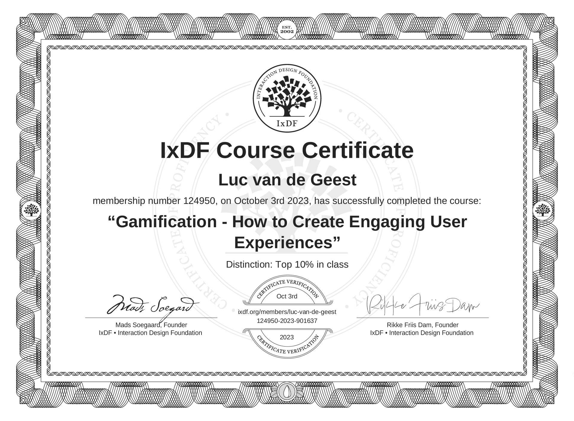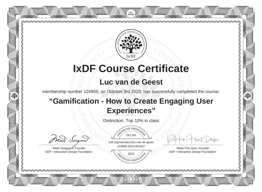 Luc van de Geest's IxDF Course Certificate: Gamification - How to Create Engaging User Experiences
