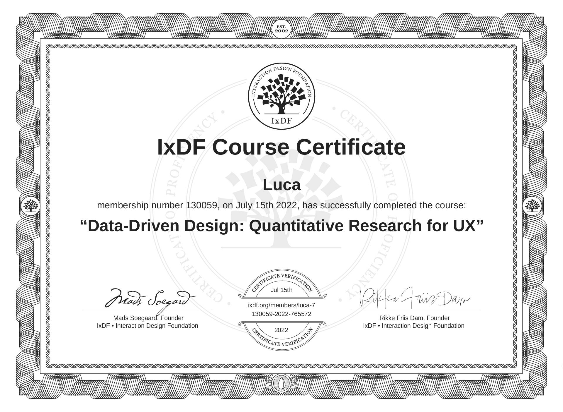 The IxDF Course Certificate above is awarded to Luca in formal recognition of their coursework surpassing the rigorous benchmarks of exceptional performance established by the IxDF Educational Codex.