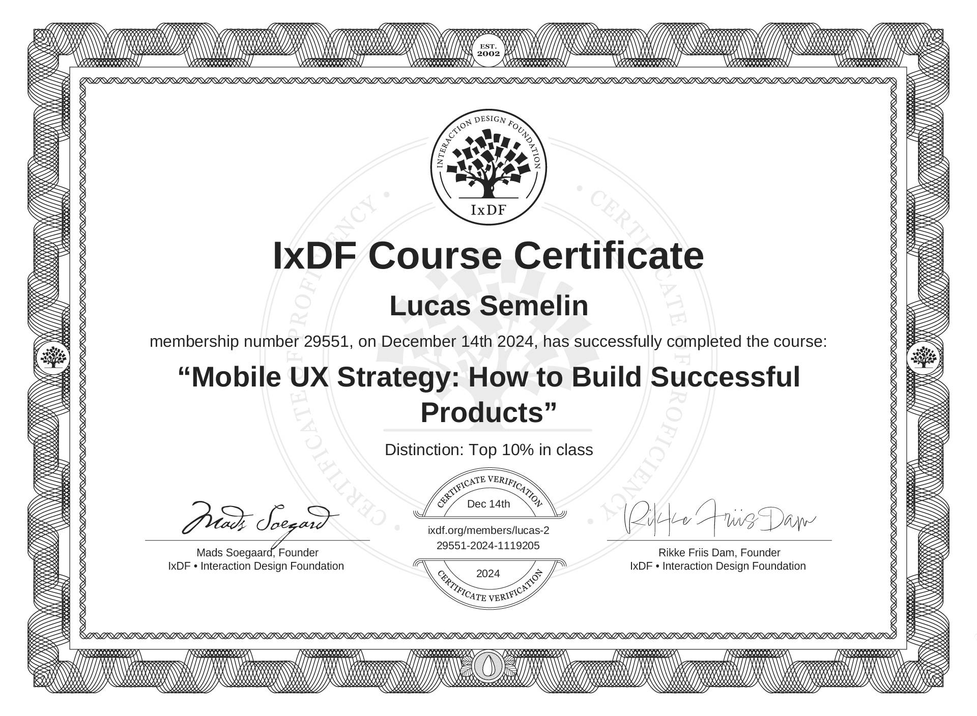 The IxDF Course Certificate above is awarded to Lucas Semelin with a Top 10% Distinction in formal recognition of their coursework surpassing the rigorous benchmarks of exceptional performance established by the IxDF Educational Codex.