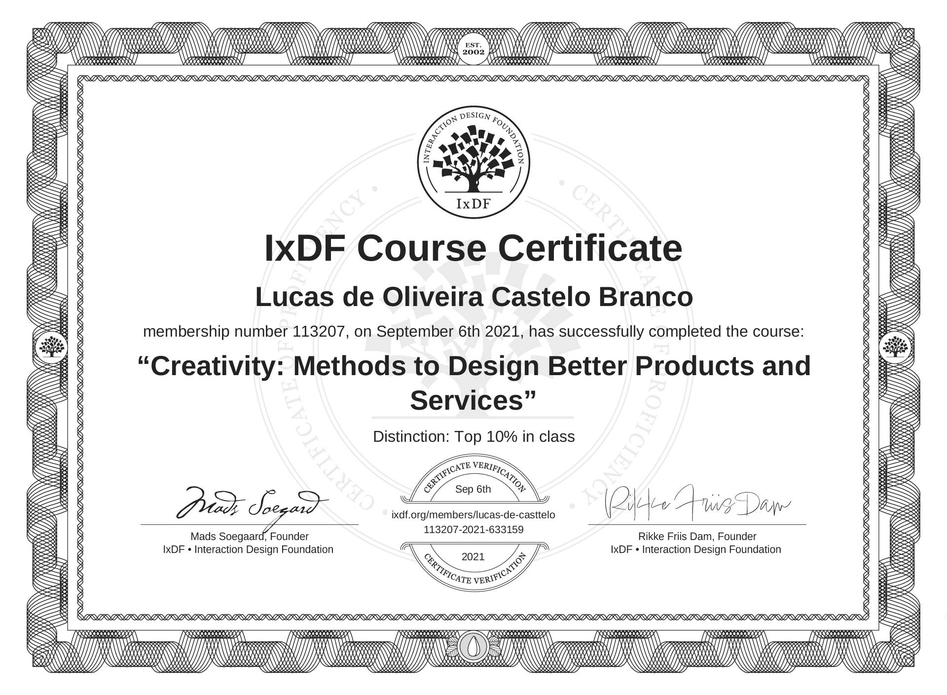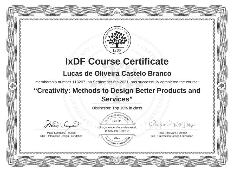 Lucas de Oliveira Castelo Branco's IxDF Course Certificate: Creativity: Methods to Design Better Products and Services