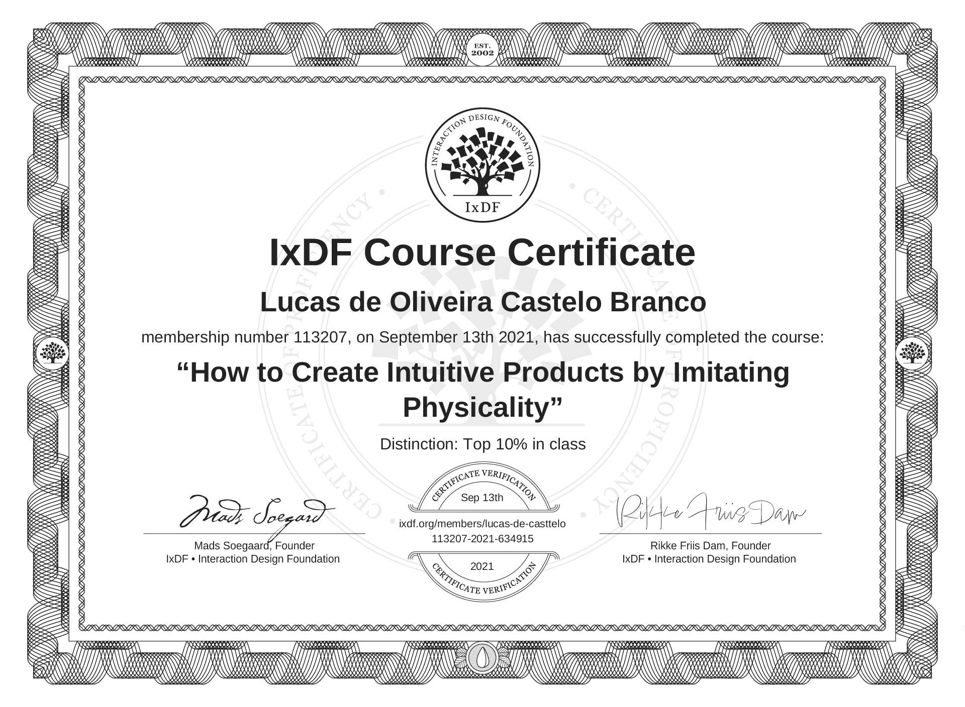 Lucas de Oliveira Castelo Branco's IxDF Course Certificate: How to Create Intuitive Products by Imitating Physicality