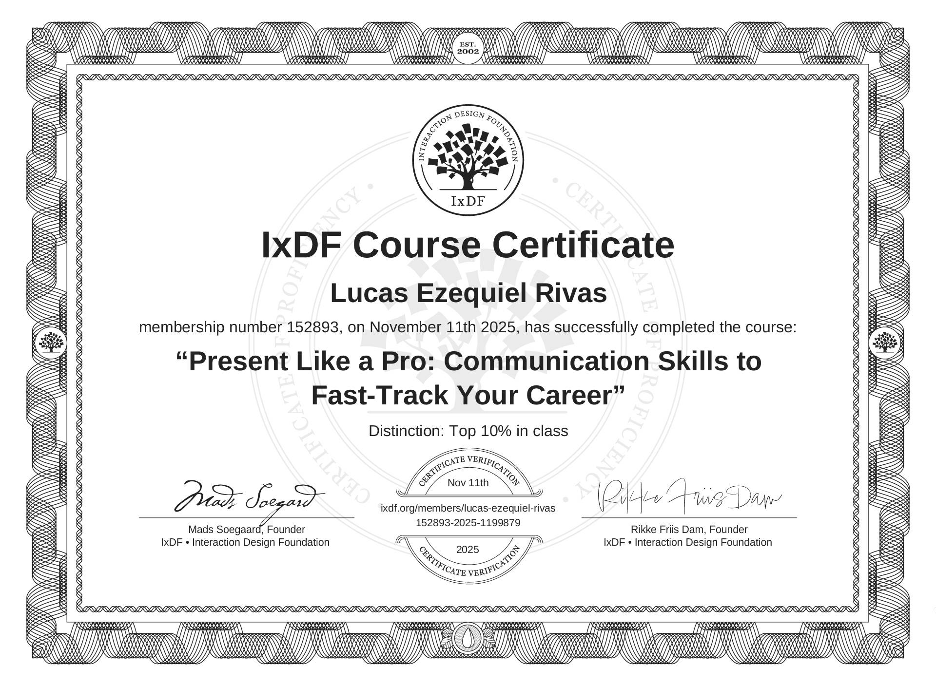Lucas Ezequiel Rivas's IxDF Course Certificate: Present Like a Pro: Communication Skills to Fast-Track Your Career