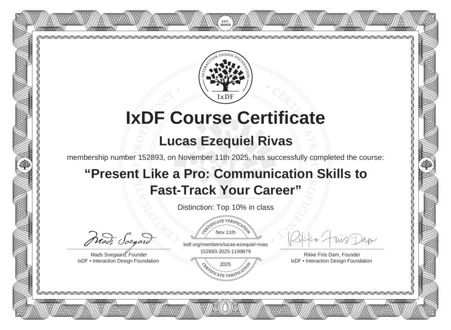 The IxDF Course Certificate above is awarded to Lucas Ezequiel Rivas with a Top 10% Distinction in formal recognition of their coursework surpassing the rigorous benchmarks of exceptional performance established by the IxDF Educational Codex.