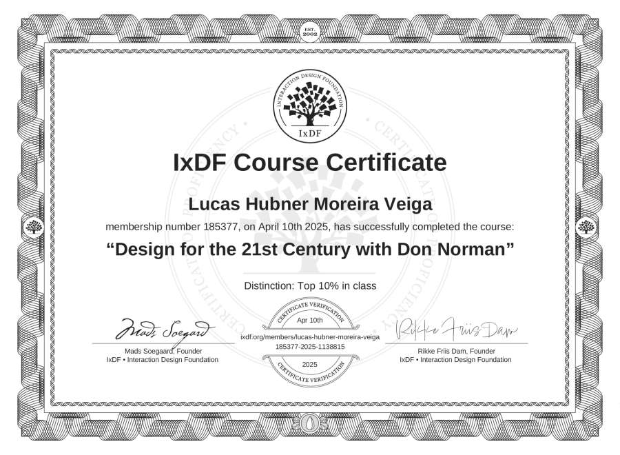 The IxDF Course Certificate above is awarded to Lucas Hübner Moreira Veiga with a Top 10% Distinction in formal recognition of their coursework surpassing the rigorous benchmarks of exceptional performance established by the IxDF Educational Codex.