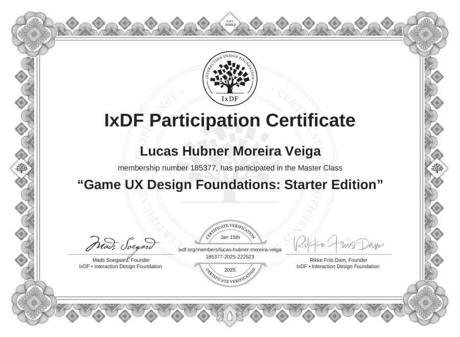 Lucas Hübner Moreira Veiga's IxDF Masterclass Certificate: Game UX Design Foundations: Starter Edition
