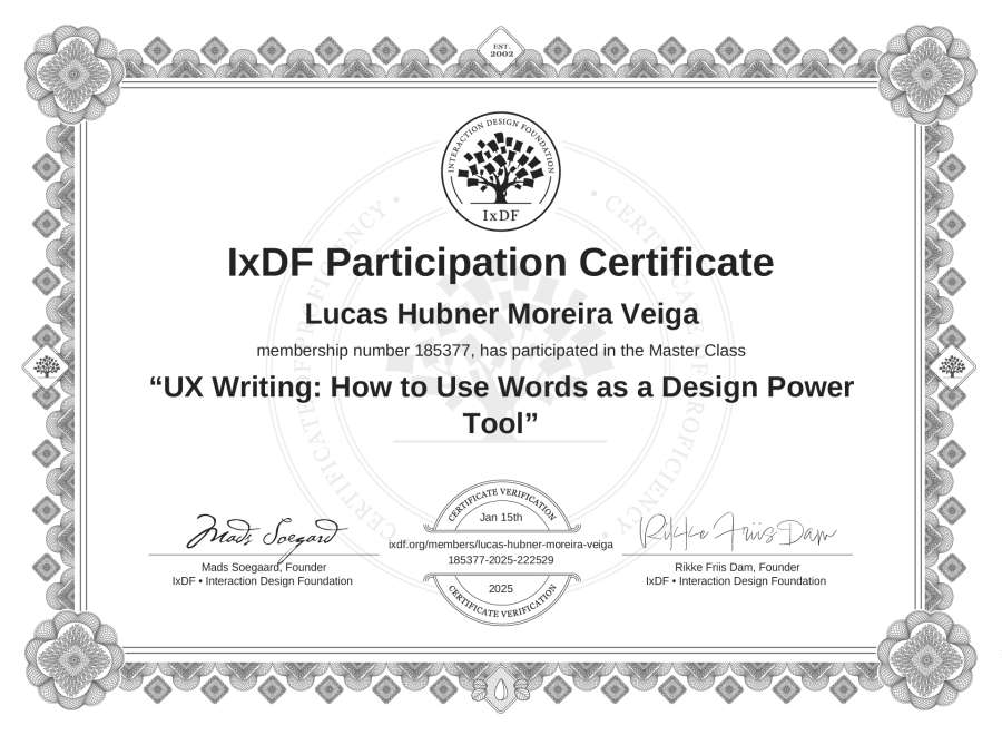 Lucas Hübner Moreira Veiga's IxDF Masterclass Certificate: UX Writing: How to Use Words as a Design Power Tool