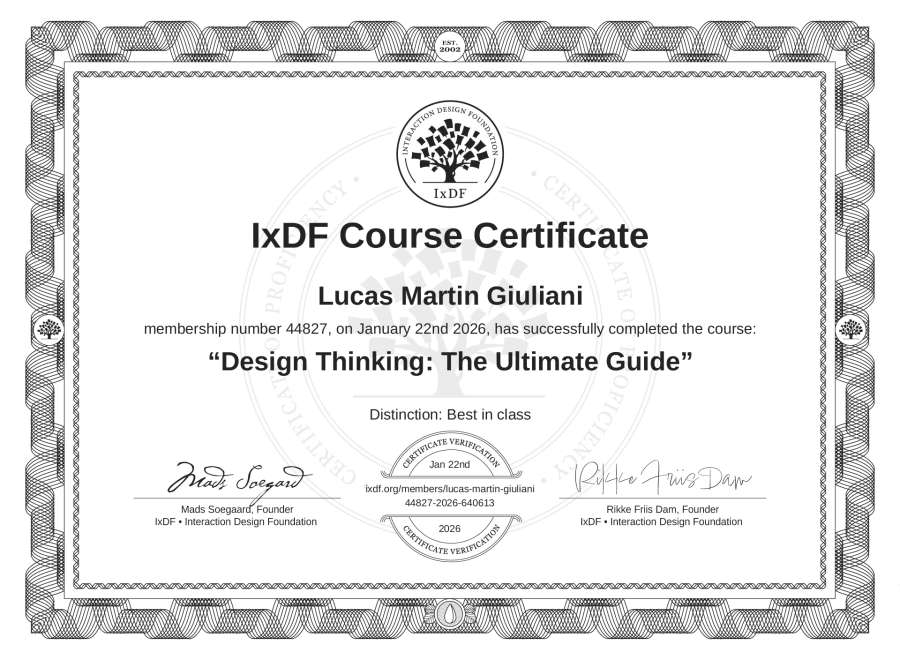 The IxDF Course Certificate above is awarded to Lucas Martin Giuliani with a Best in Class Distinction in formal recognition of their coursework surpassing the rigorous benchmarks of exceptional performance established by the IxDF Educational Codex.