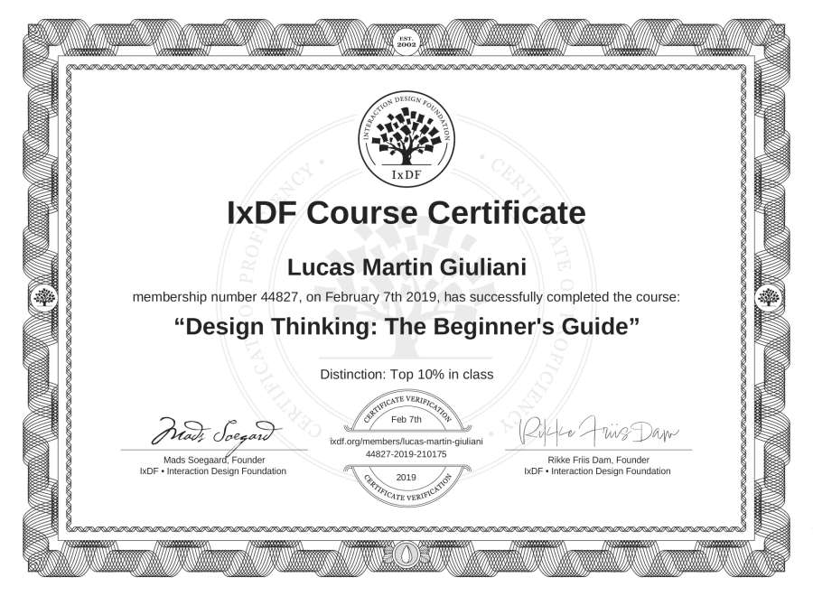 The IxDF Course Certificate above is awarded to Lucas Martin Giuliani with a Top 10% Distinction in formal recognition of their coursework surpassing the rigorous benchmarks of exceptional performance established by the IxDF Educational Codex.