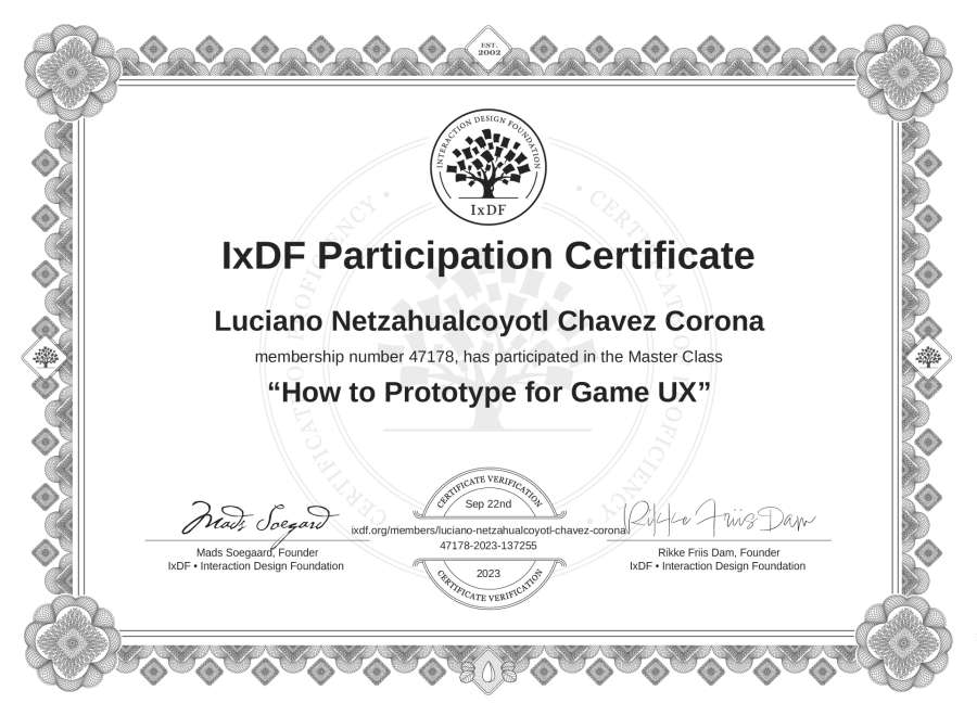 Luciano Netzahualcóyotl Chávez Corona's IxDF Masterclass Certificate: How to Prototype for Game UX