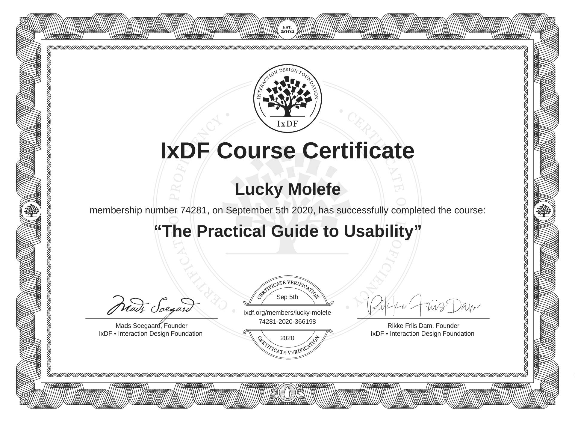 Lucky Molefe's IxDF Course Certificate: The Practical Guide to Usability