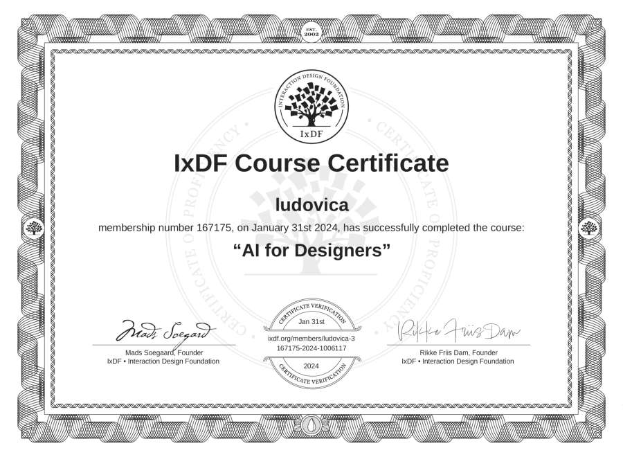 The IxDF Course Certificate above is awarded to ludovica in formal recognition of their coursework surpassing the rigorous benchmarks of exceptional performance established by the IxDF Educational Codex.