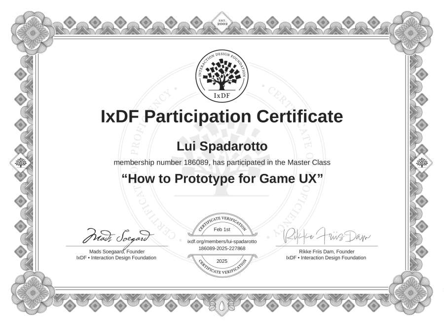 Lui Spadarotto's IxDF Masterclass Certificate: How to Prototype for Game UX