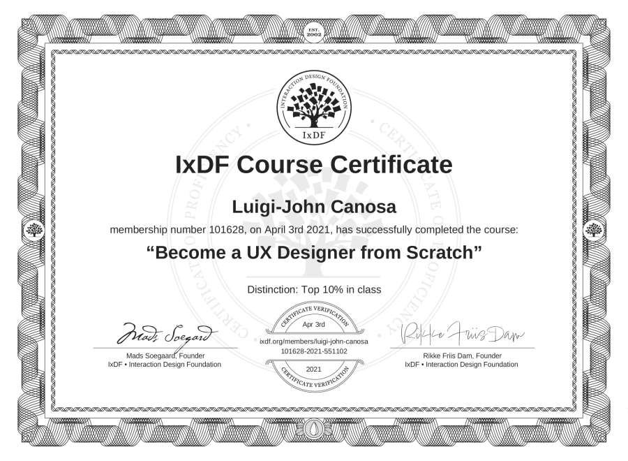 Luigi-John Canosa's IxDF Course Certificate: Become a UX Designer from Scratch