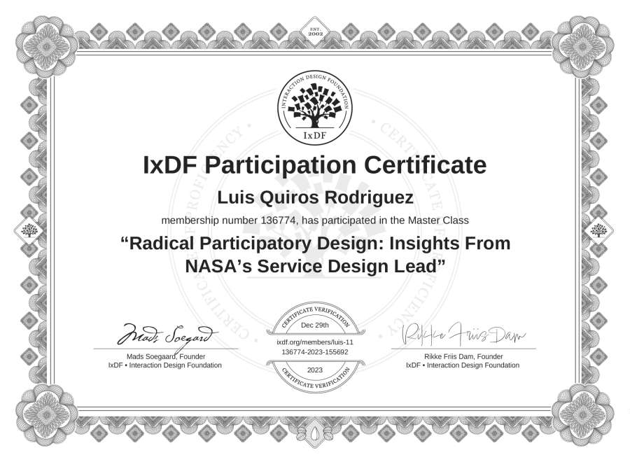 Luis Quirós Rodríguez's IxDF Masterclass Certificate: Radical Participatory Design: Insights From NASA’s Service Design Lead