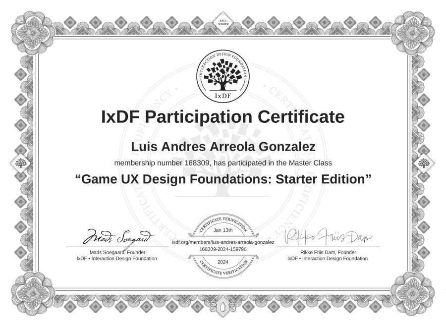 Luis Andres Arreola Gonzalez's IxDF Masterclass Certificate: Game UX Design Foundations: Starter Edition