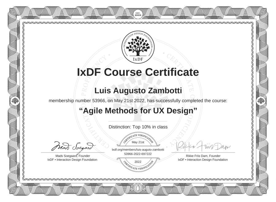 The IxDF Course Certificate above is awarded to Luis Augusto Zambotti with a Top 10% Distinction in formal recognition of their coursework surpassing the rigorous benchmarks of exceptional performance established by the IxDF Educational Codex.