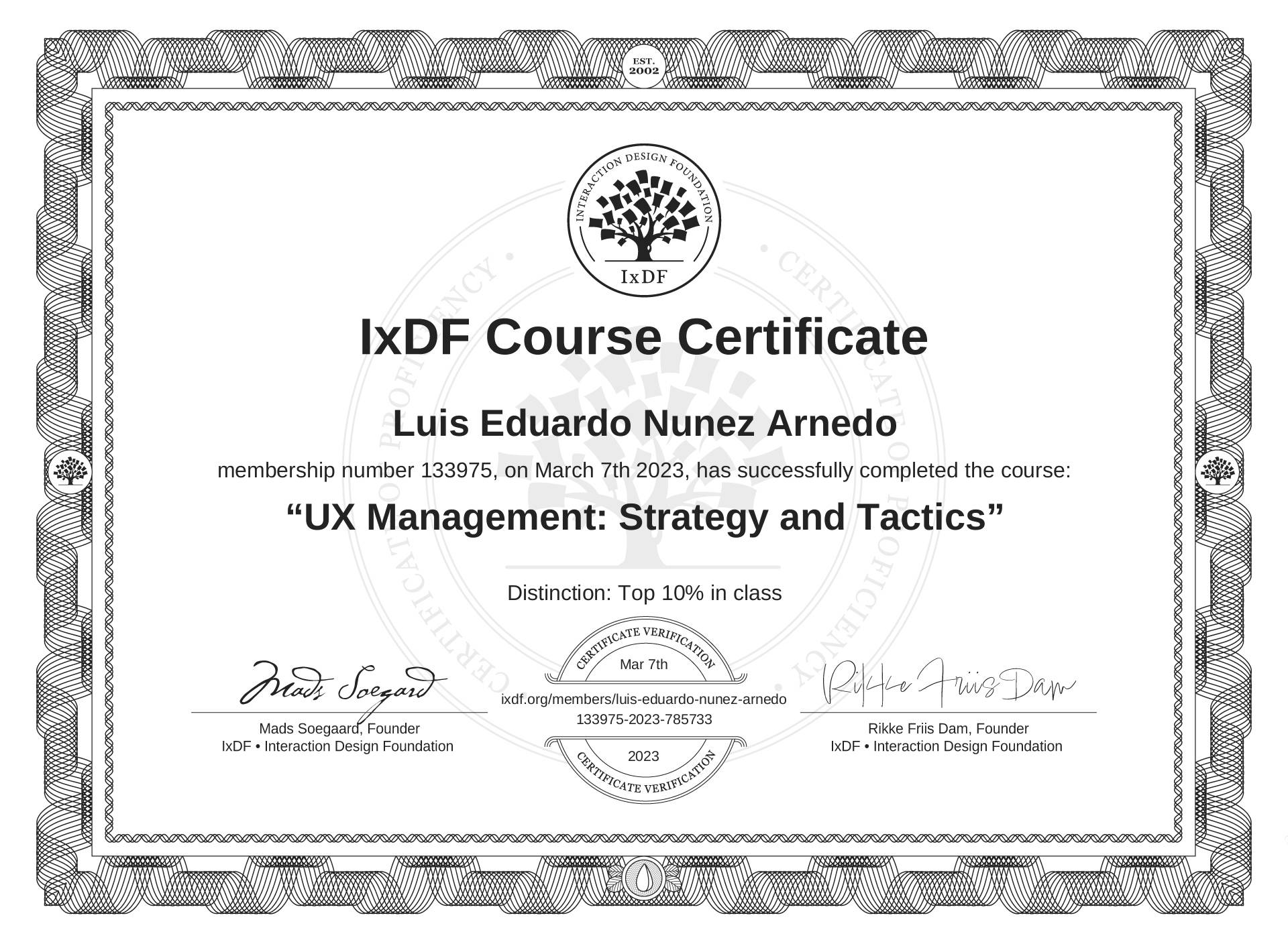 The IxDF Course Certificate above is awarded to Luis Eduardo Nuñez Arnedo with a Top 10% Distinction in formal recognition of their coursework surpassing the rigorous benchmarks of exceptional performance established by the IxDF Educational Codex.