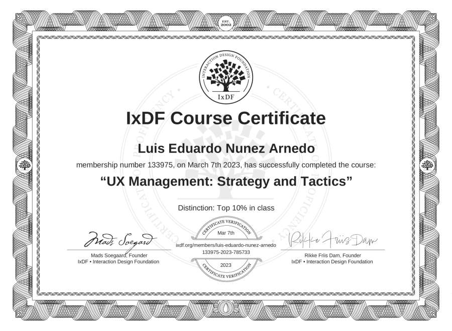 Luis Eduardo Nuñez Arnedo's IxDF Course Certificate: UX Management: Strategy and Tactics