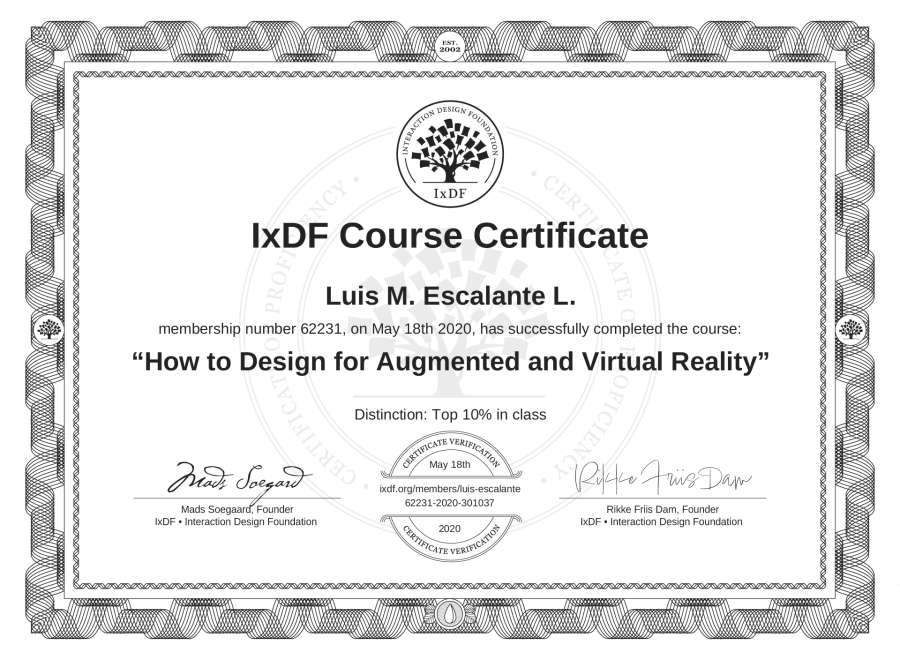 Luis M. Escalante L.'s IxDF Course Certificate: How to Design for Augmented and Virtual Reality