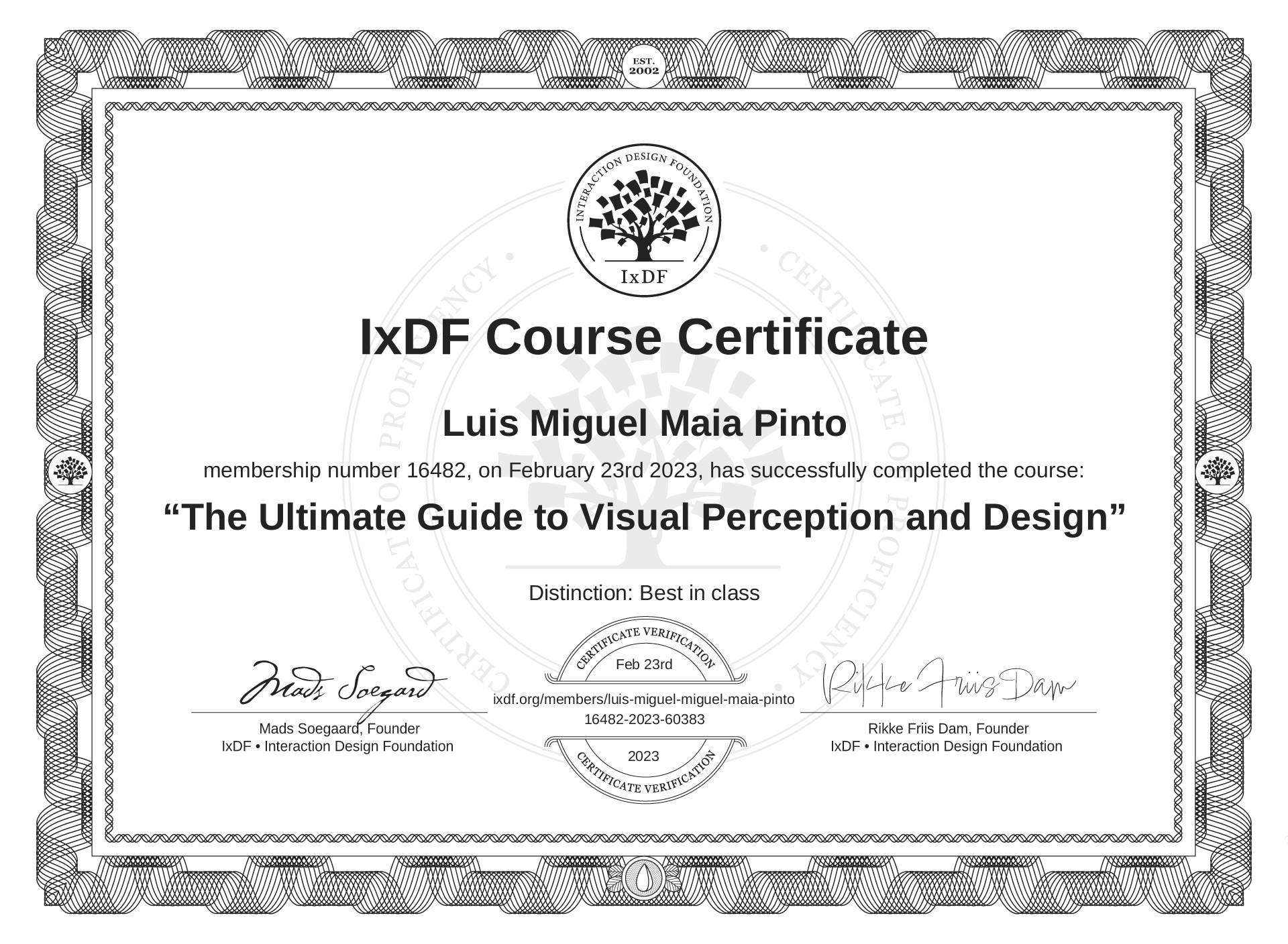 The IxDF Course Certificate above is awarded to Luis Miguel Maia Pinto with a Best in Class Distinction in formal recognition of their coursework surpassing the rigorous benchmarks of exceptional performance established by the IxDF Educational Codex.