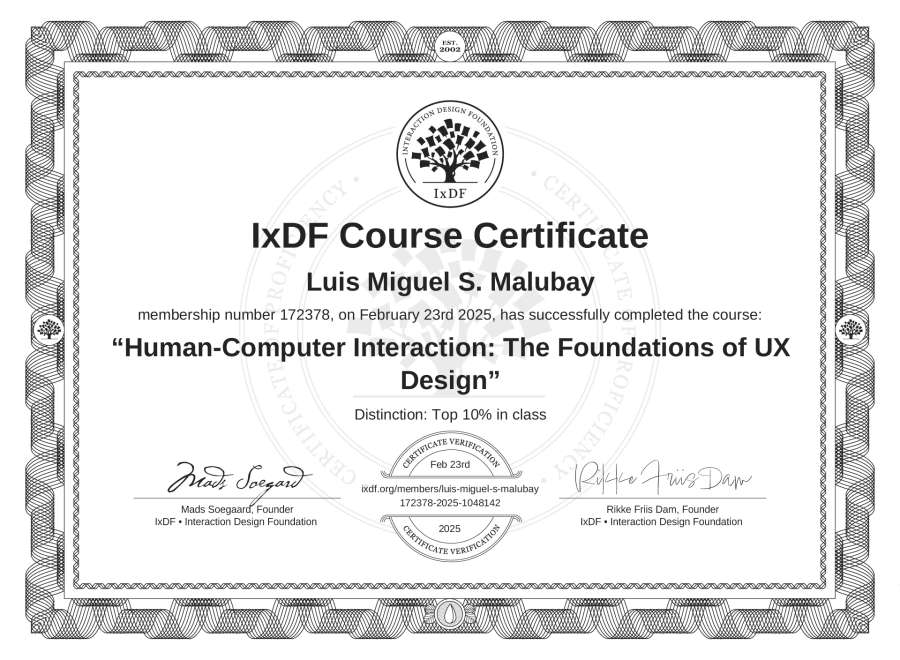 Luis Miguel S. Malubay's IxDF Course Certificate: Human-Computer Interaction: The Foundations of UX Design
