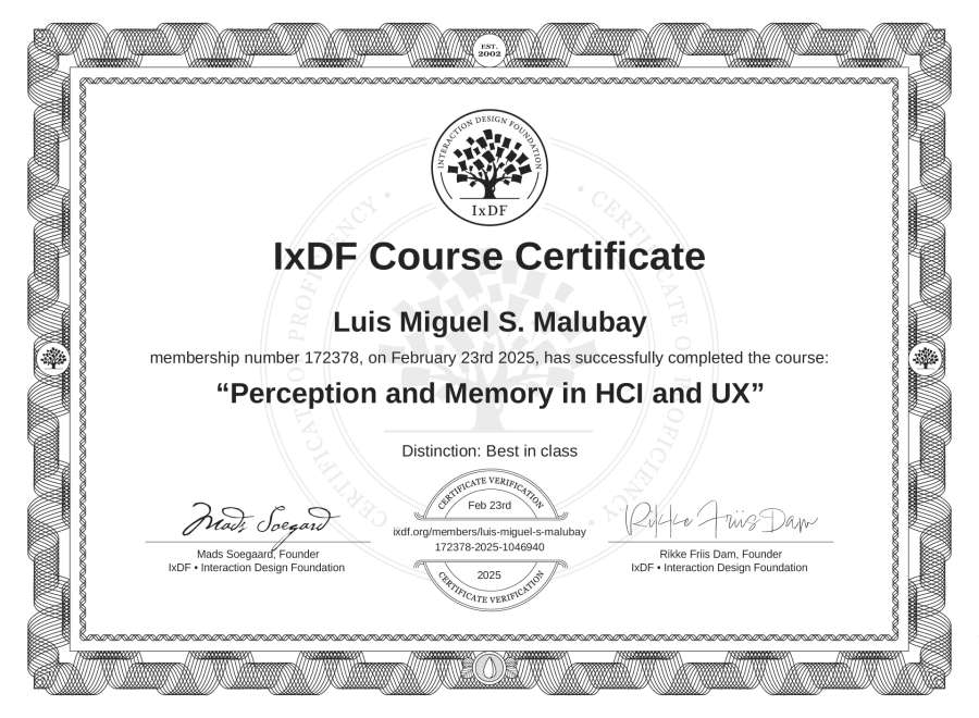 Luis Miguel S. Malubay's IxDF Course Certificate: Perception and Memory in HCI and UX