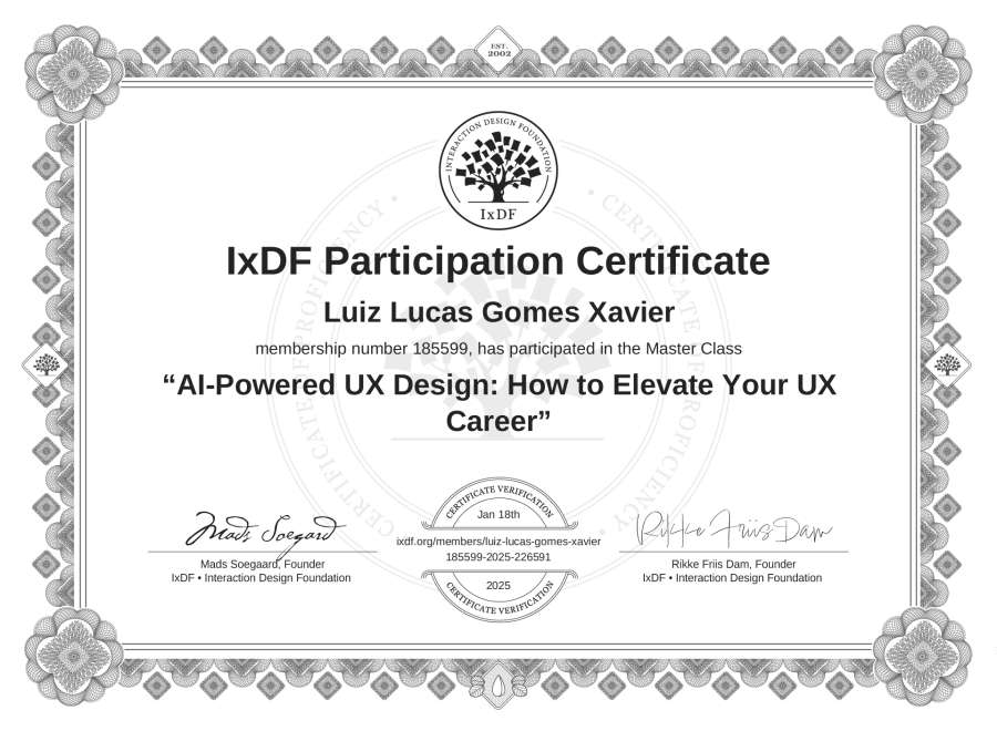 Luiz Lucas Gomes Xavier's IxDF Masterclass Certificate: AI-Powered UX Design: How to Elevate Your UX Career