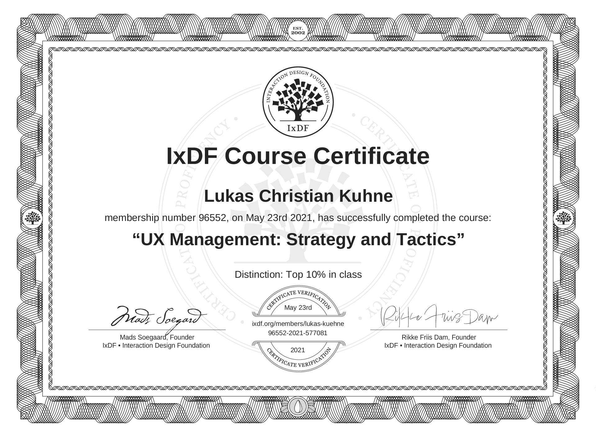 Lukas Christian Kühne's IxDF Course Certificate: UX Management: Strategy and Tactics
