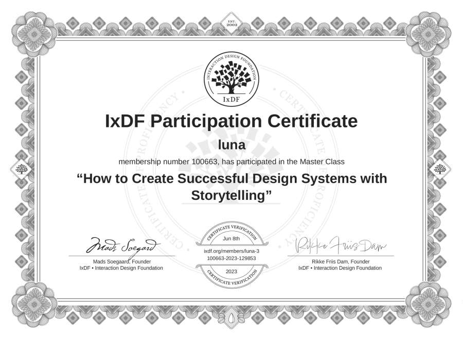 luna's IxDF Masterclass Certificate: How to Create Successful Design Systems with Storytelling