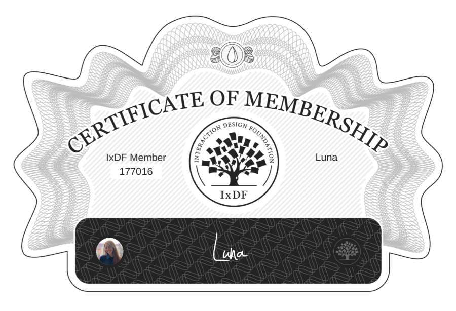 The Membership Certificate below verifies that Luna is a member of Interaction Design Foundation.