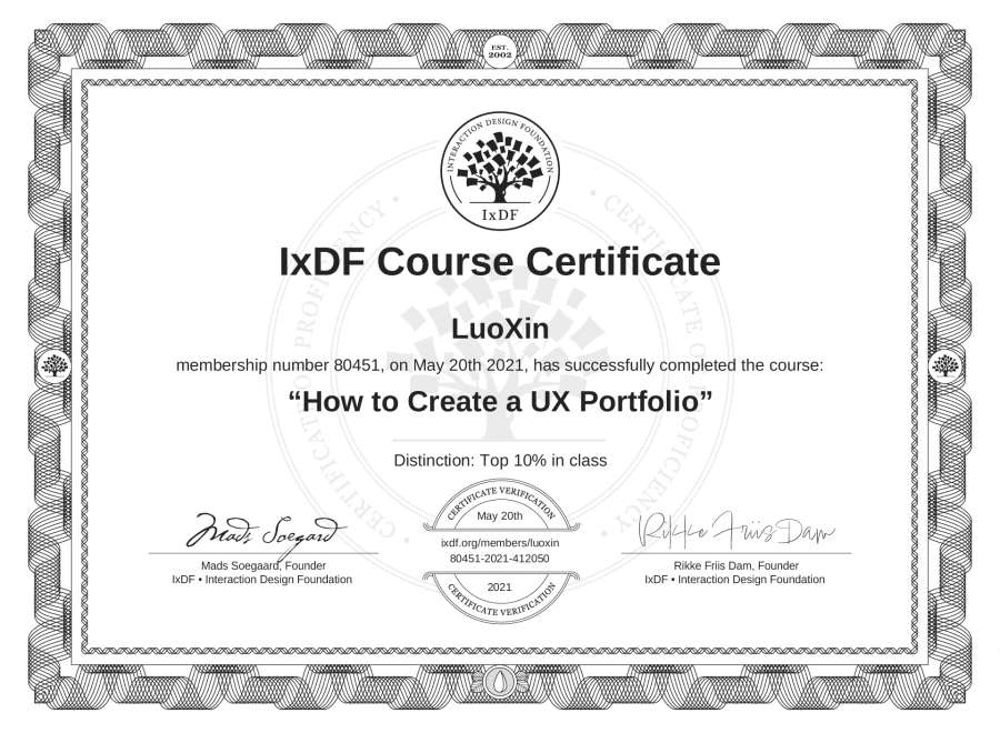 LuoXin's IxDF Course Certificate: How to Create a UX Portfolio