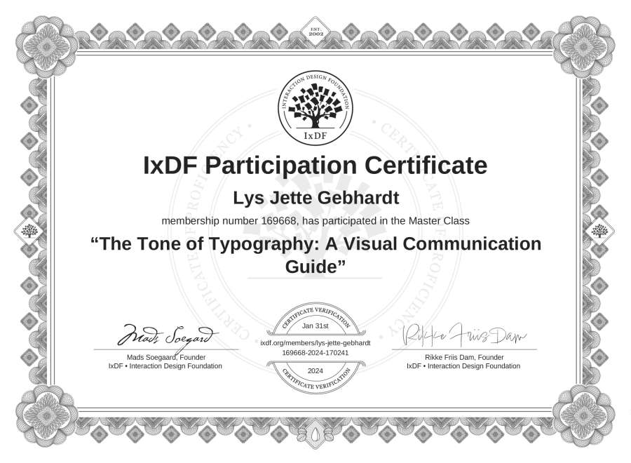Lys Jette Gebhardt's IxDF Masterclass Certificate: The Tone of Typography: A Visual Communication Guide