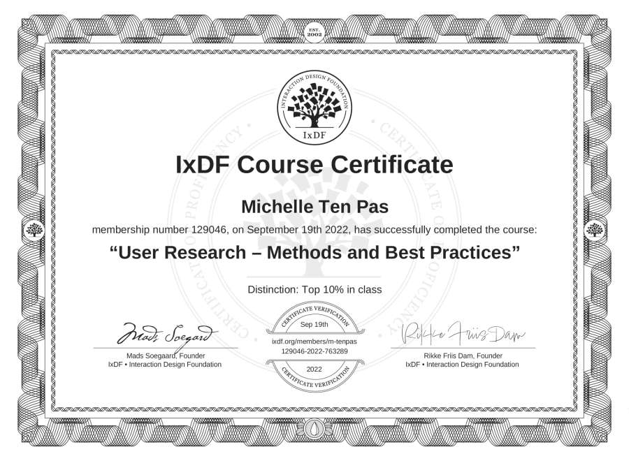 Michelle Ten Pas's IxDF Course Certificate: User Research – Methods and Best Practices